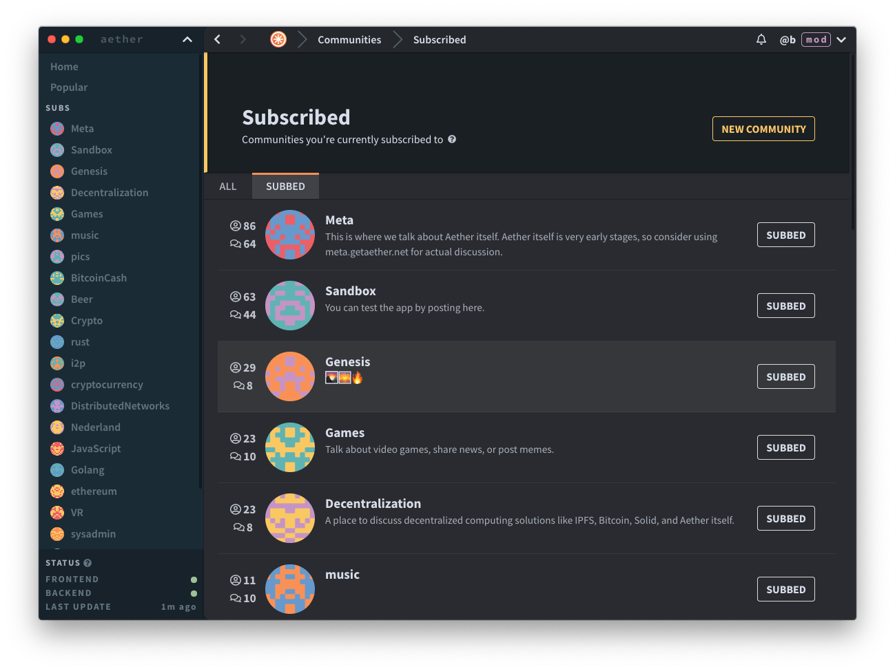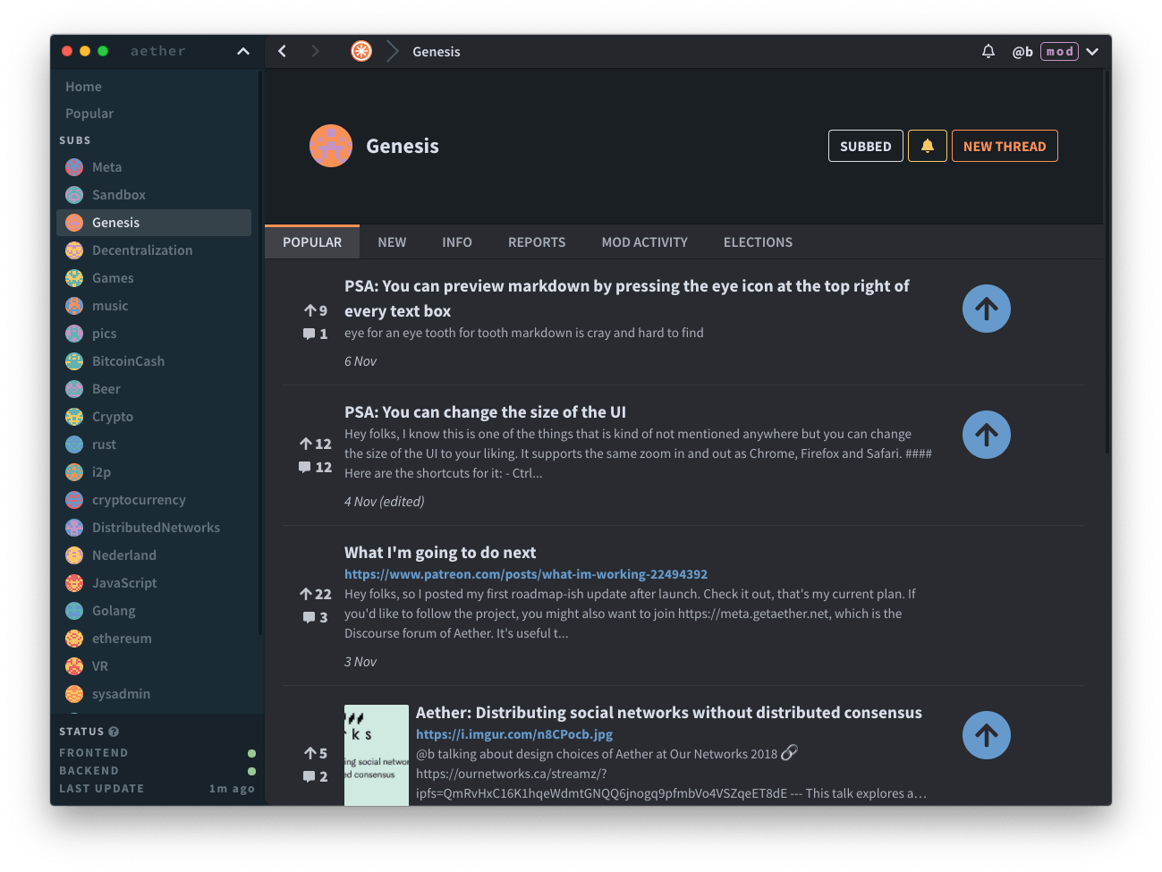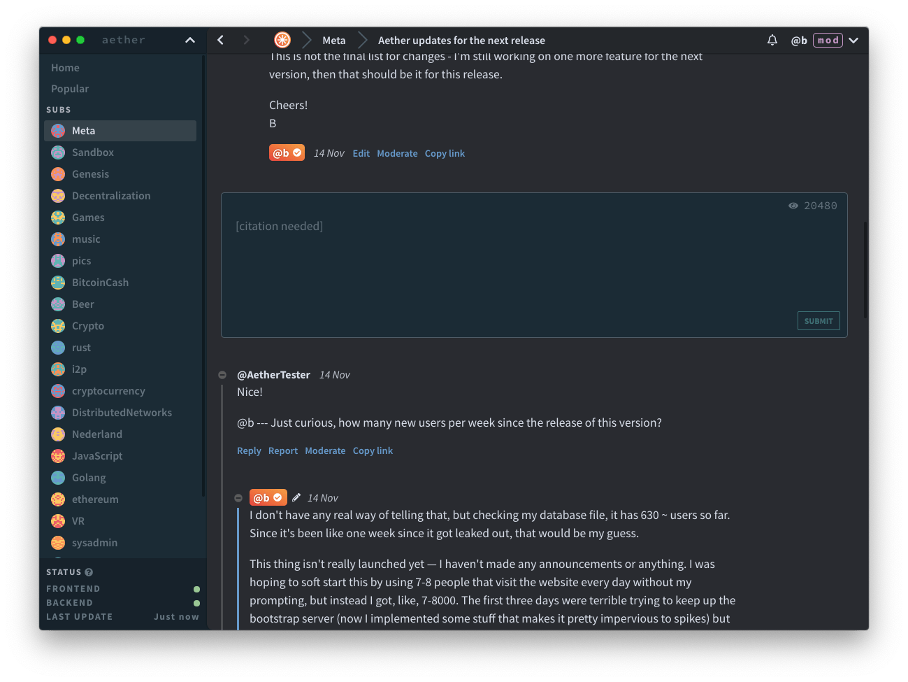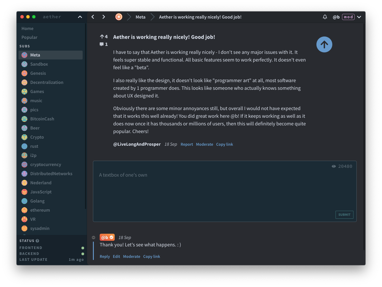 "Aether is working really nicely! Good job! I don't see any major issues with it. It feels super stable and functional. All basic features seem to work perfectly. It doesn't even feel like a "beta". I also really like the design, it doesn't look like "programmer art" at all. This looks like someone who actually knows something about UX designed it."